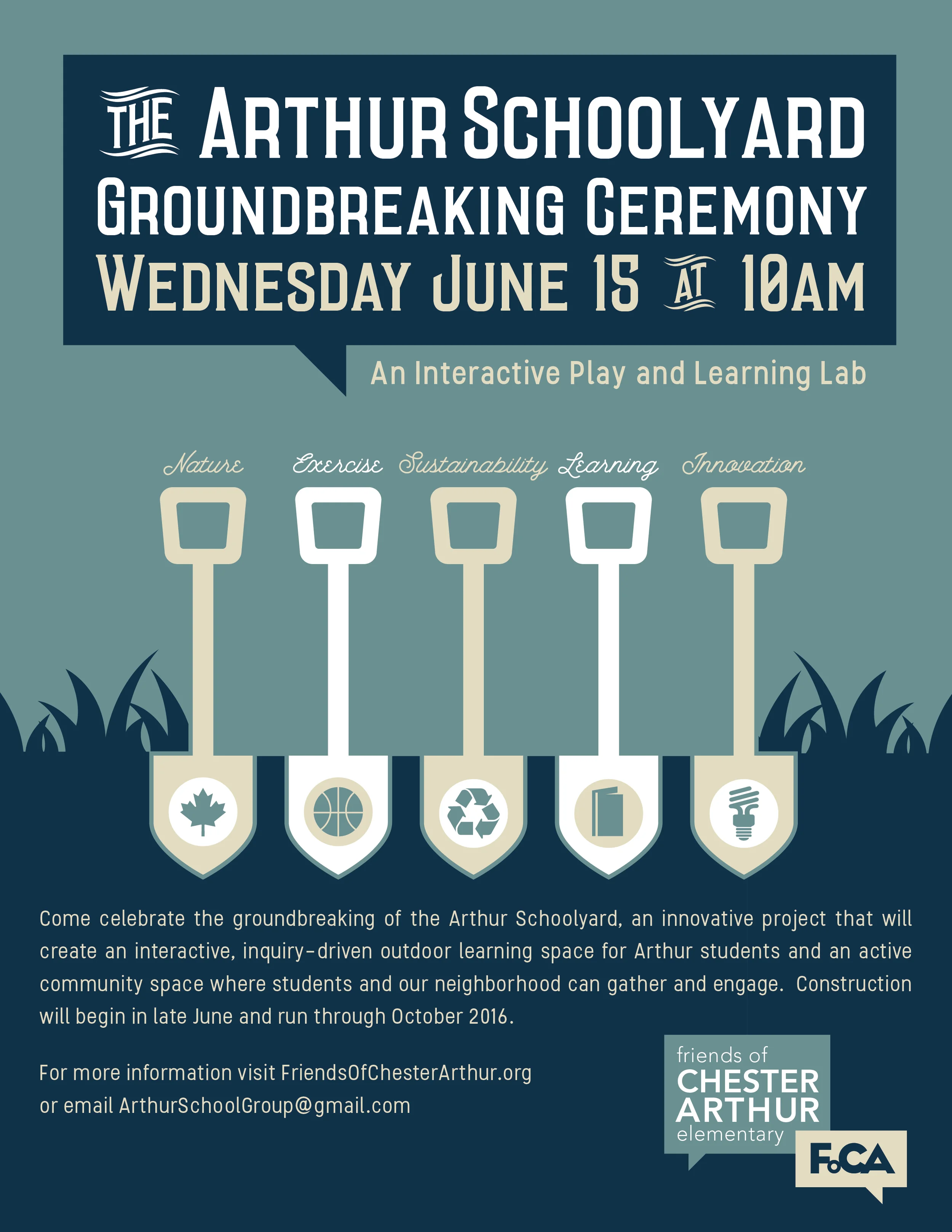 Come hear about The Arthur Schoolyard, an innovative project that will center on creating an active inquiry-driven learning space for Arthur students and a space where both students and members of the larger community can gather and engage in structured and unstructured play and feel more connected with our neighborhood school. Construction will begin in late June and run through October 2016.