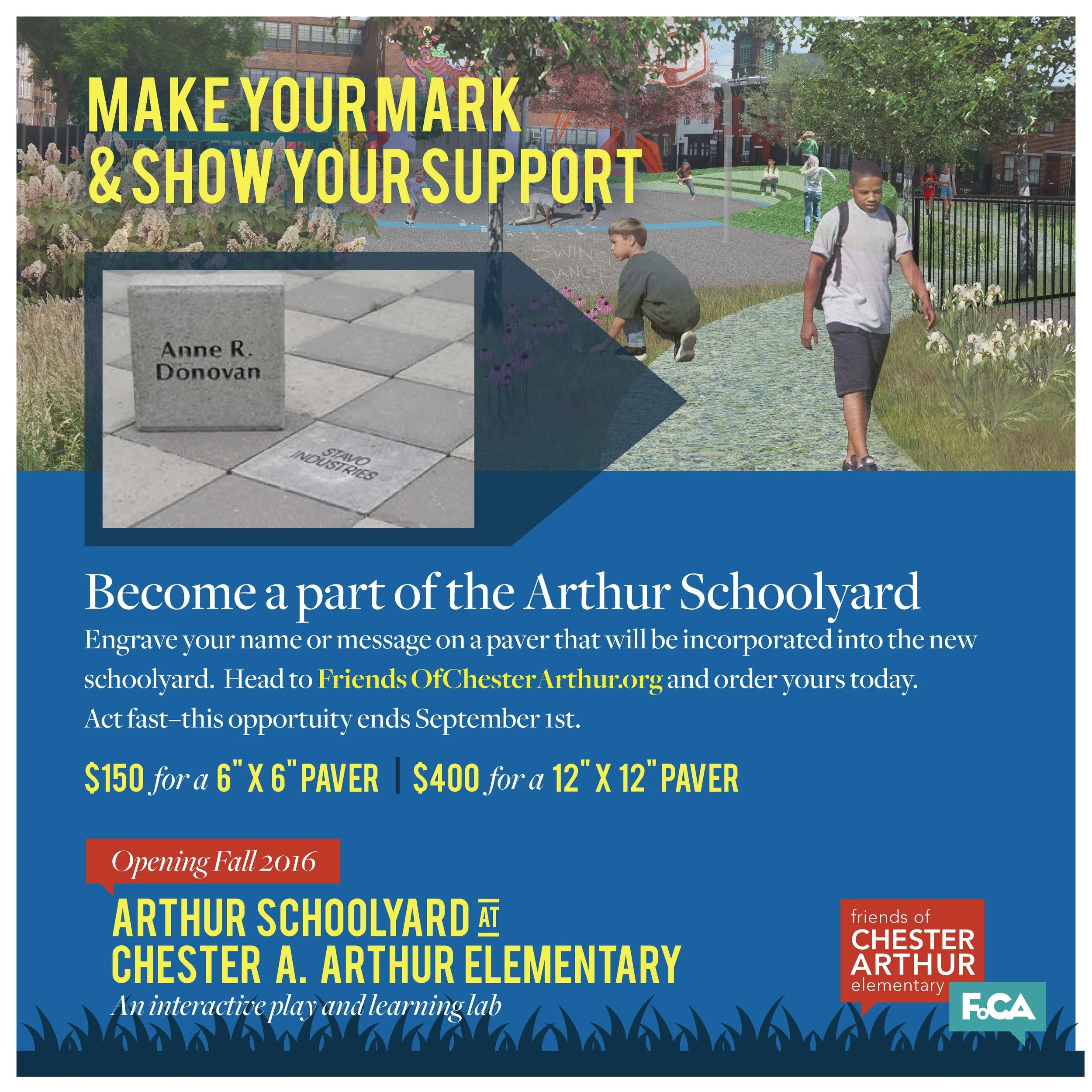 To donate, please visit friendsofchesterarthur.org, select your paver and provide your custom message. All donations must be made by September 1. We thank you for your support, and we look forward to enjoying the Arthur Schoolyard with you!